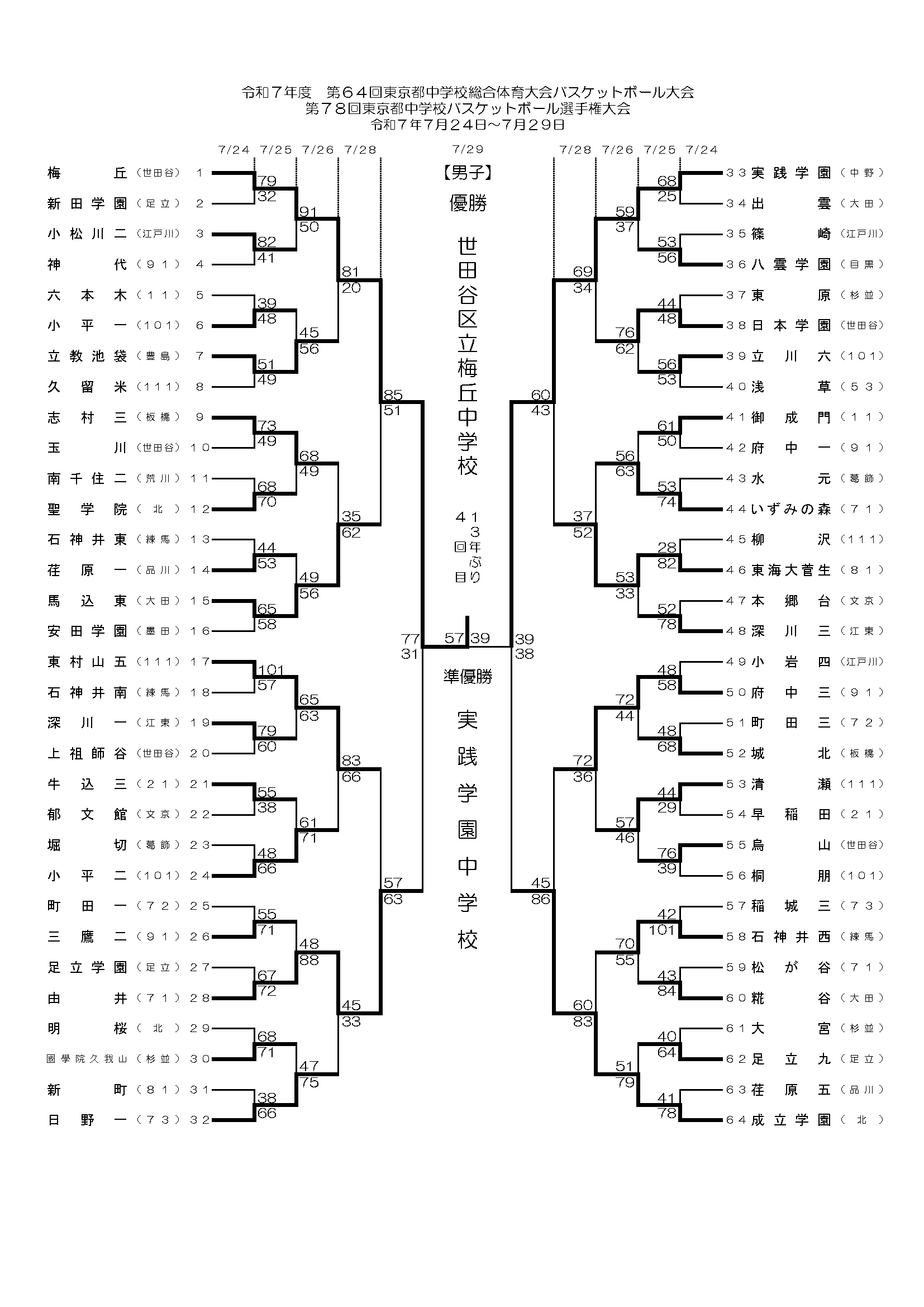 2025.08更新 令和7年度 東京都中学校バスケットボール大会(第64回総体・第78回選手権) 令和7年度 第64回東京都中学校総合体育大会バスケットボール大会第78回東京都中学校バスケットボール選手権大会令和7年7月24日~7月29日 戻る 一覧 進む すべて 試合結果